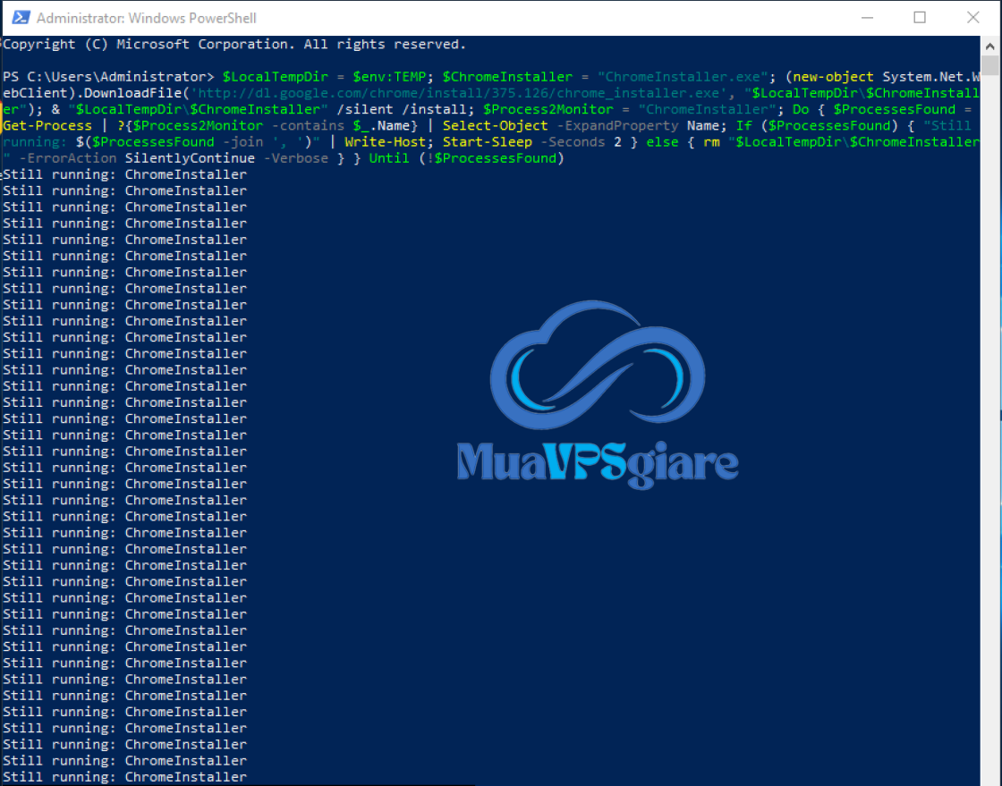 $chromeUrl = "https://dl.google.com/chrome/install/GoogleChromeStandaloneEnterprise.msi"$installerPath = "$env:TEMP\ChromeInstaller.msi"Write-Host "Đang tải Google Chrome..."Invoke-WebRequest -Uri $chromeUrl -OutFile $installerPathWrite-Host "Đang cài đặt Google Chrome..."Start-Process -FilePath "msiexec.exe" -ArgumentList "/i $installerPath /quiet /norestart" -WaitRemove-Item -Path $installerPathWrite-Host