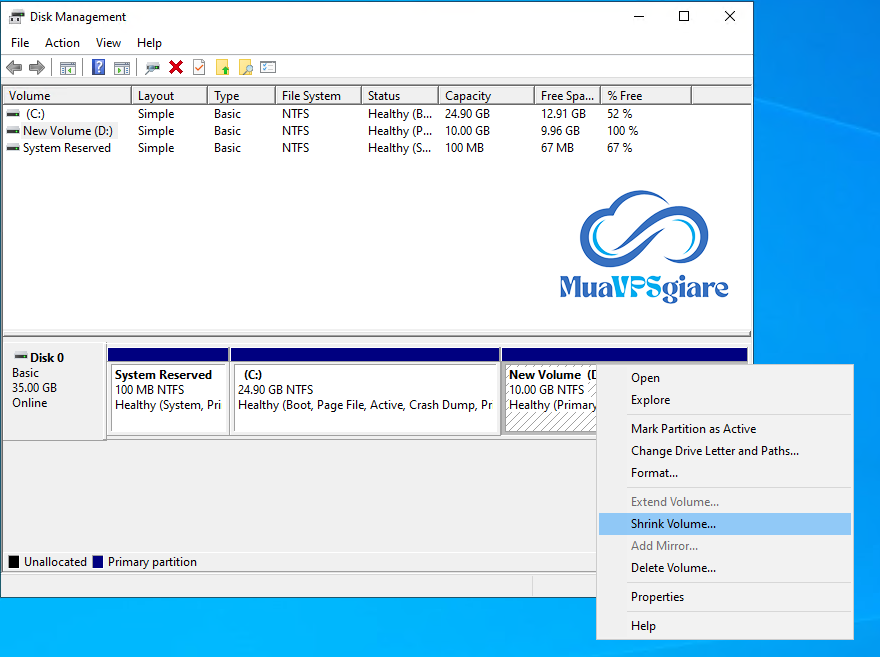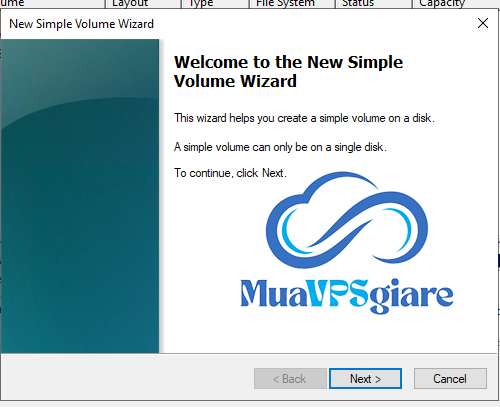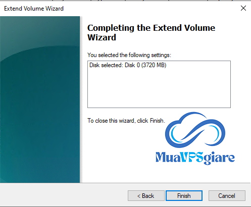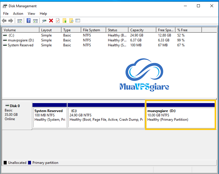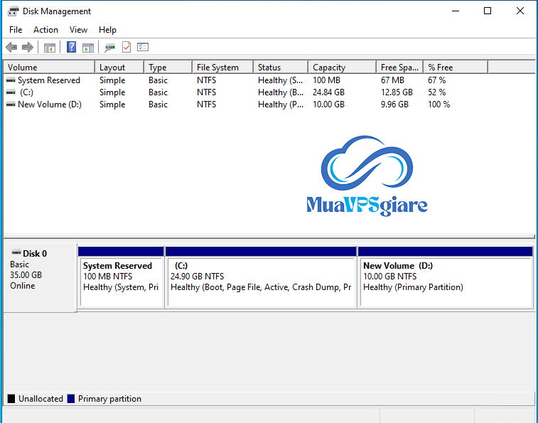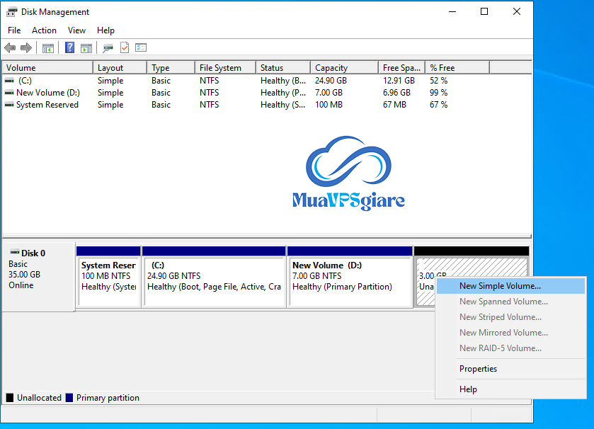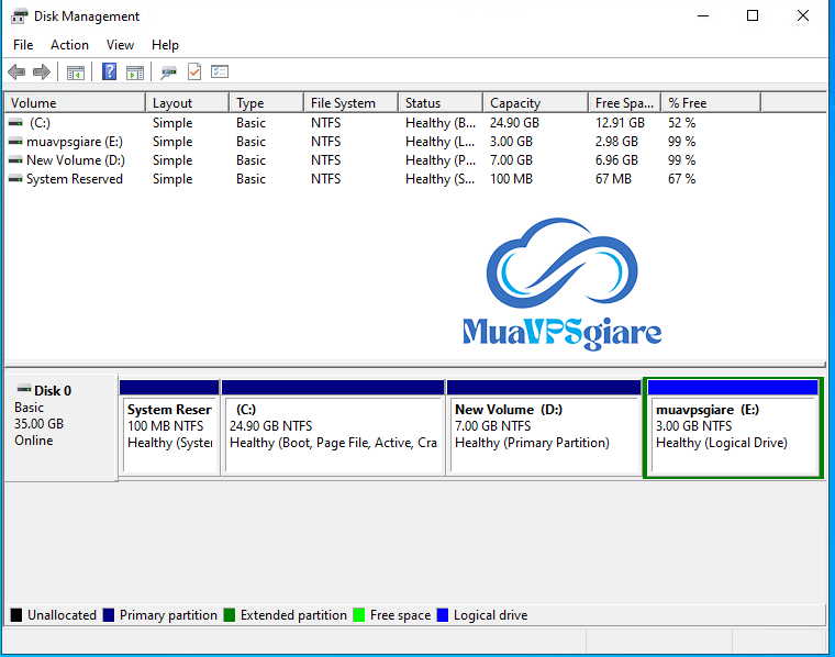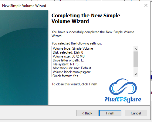 Lúc này, bạn sẽ thấy ổ đĩa mới với tên muavpsgiare đã được tạo thành công, có dung lượng 3.00 GB.