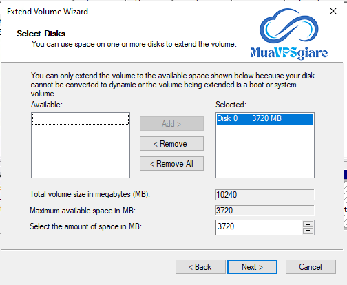 Nhập dung lượng cần mở rộng cho ổ đĩa (có thể để nguyên nếu muốn dùng hết phần trống có sẵn), rồi bấm Next để tiếp tục.
