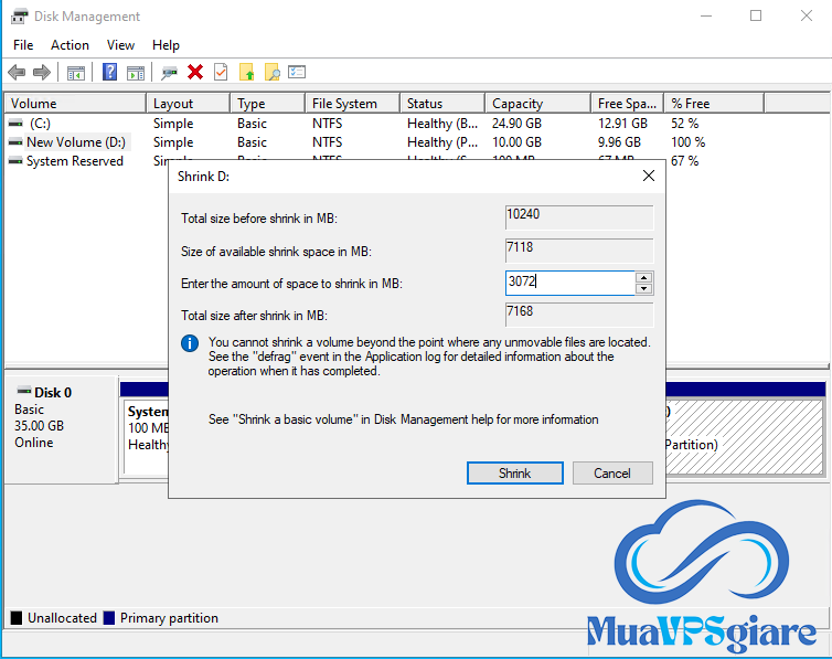 Nhập dung lượng bạn muốn tách ra cho ổ mới (ví dụ: muốn tạo ổ 3GB thì nhập 3072 vào ô), rồi bấm Shrink để hệ thống tiến hành cắt dung lượng từ ổ đang chọn.