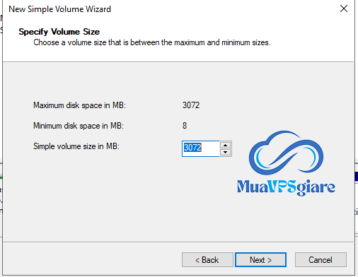Ở bước này, bạn chỉ cần nhập dung lượng ổ đĩa muốn tạo (có thể giữ nguyên giá trị mặc định nếu muốn dùng toàn bộ), rồi bấm Next.