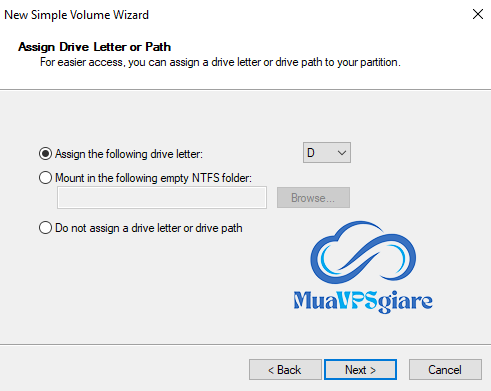 Ở bước này, bạn chọn chữ cái đại diện cho ổ đĩa mới (ví dụ: E, F,…). Chọn xong thì bấm Next để sang bước tiếp theo.