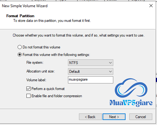 Bạn có thể nhập tên cho ổ đĩa mới ở phần Volume label để dễ nhận biết sau này. Đặt xong thì bấm Next.