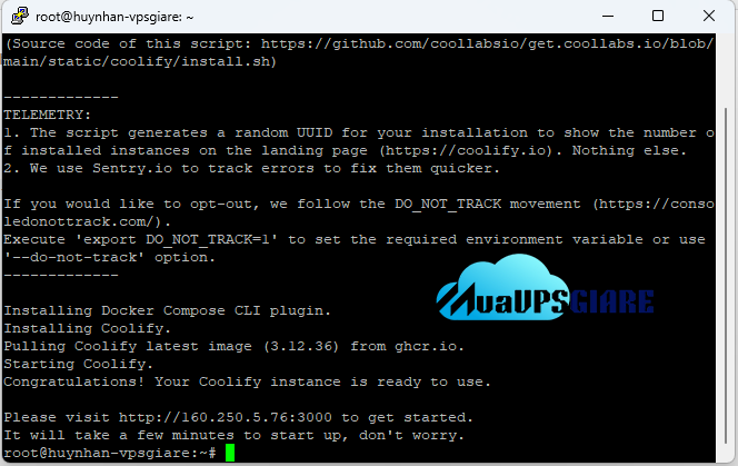 Khi quá trình hoàn tất, bạn sẽ nhận được thông báo với URL để truy cập vào giao diện web của Coolify.