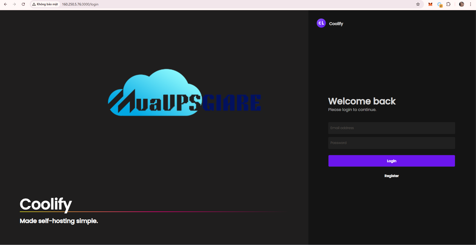 Mở Giao Diện Web:Sau khi cài đặt hoàn tất, bạn mở trình duyệt và nhập địa chỉ URL mà Coolify cung cấp. Tại đây, bạn sẽ được yêu cầu đăng nhập bằng tài khoản của mình để có thể dễ dàng quản lý và điều hành các dự án trên giao diện web của Coolify.