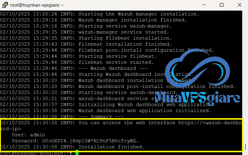 Sau khi hoàn tất, script sẽ cung cấp thông tin đăng nhập mặc định để bạn có thể truy cập giao diện Wazuh. Bạn có thể xem thông tin này ngay trên màn hình đầu ra của script hoặc trong file ghi log tại đường dẫn:/var/ossec/logs/wazuh-install-results.log.