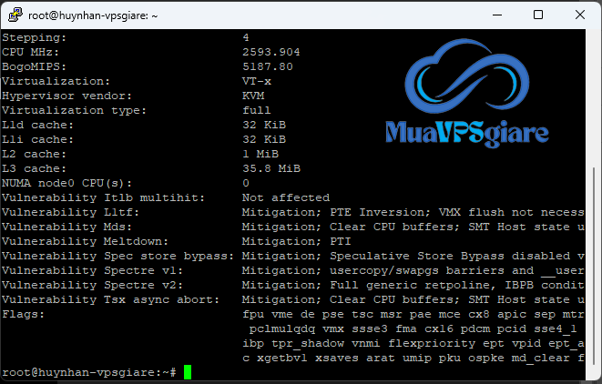 Lệnh này hiển thị thông tin chi tiết về CPU của VPS.