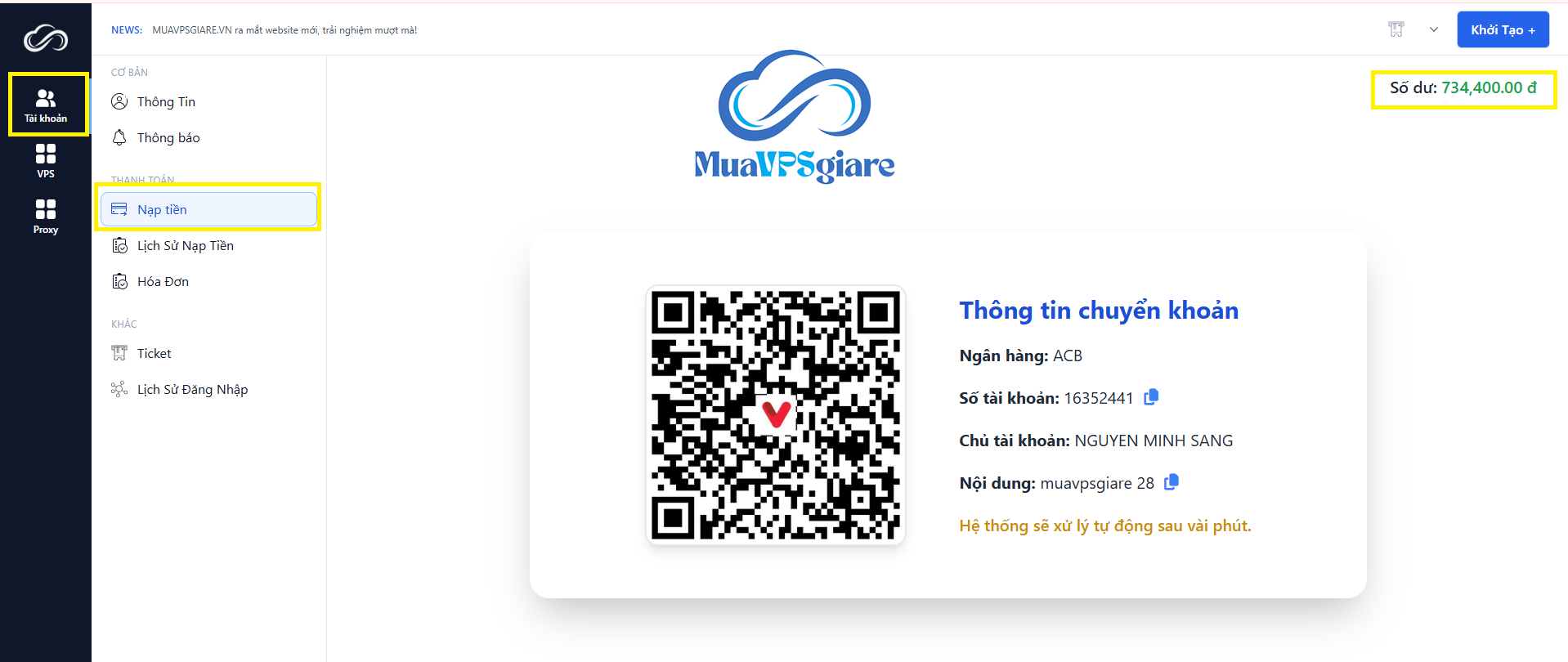 Bạn vào mục Tài khoản – Nạp tiền. Tại đây, hệ thống hiển thị mã QR Code và thông tin chuyển khoản. Sau khi hoàn tất, hệ thống sẽ tự động xử lý và cộng số dư vào tài khoản của bạn chỉ sau vài phút.