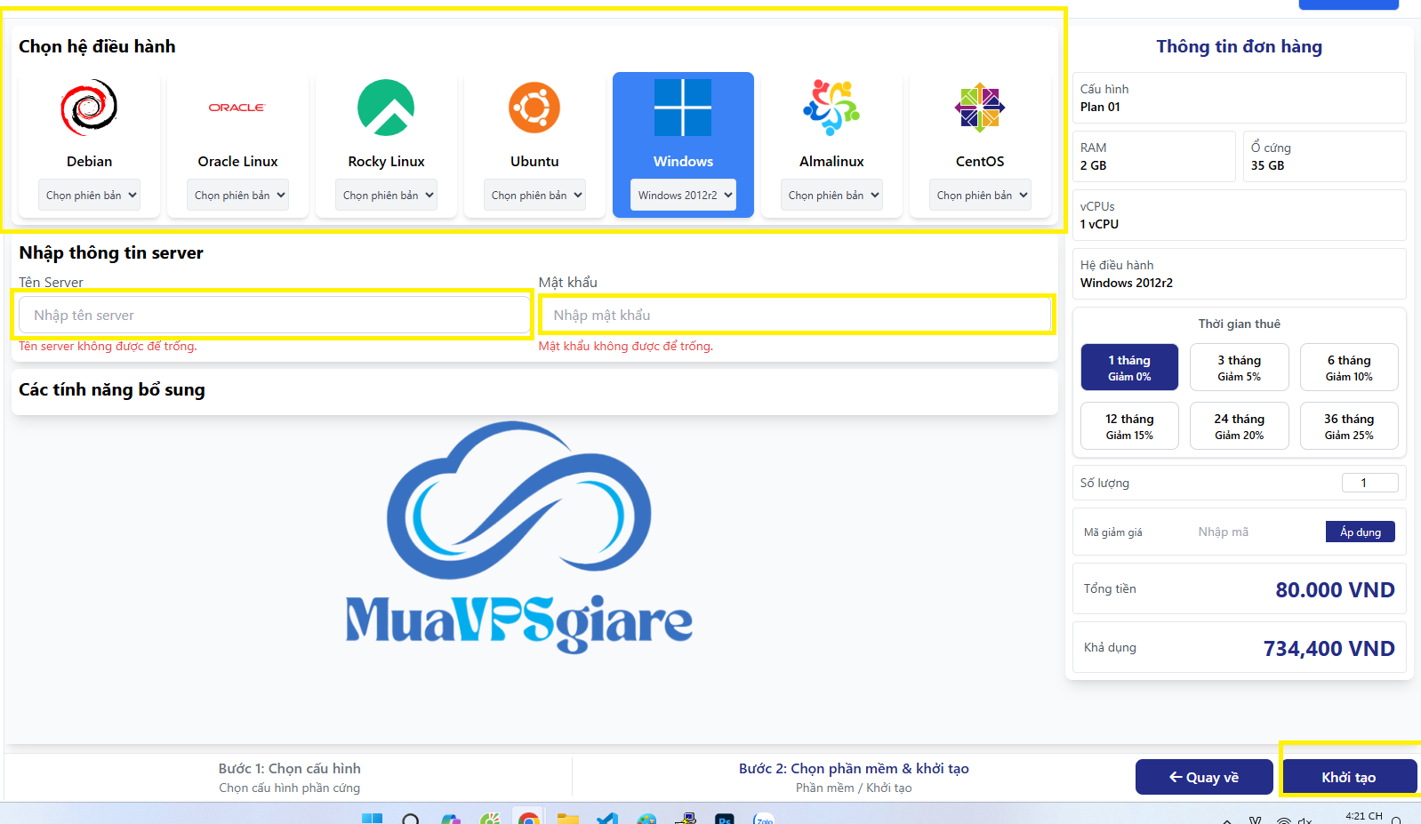 Chọn hệ điều hành, nhập Tên serverMật khẩu, chọn thời gian thuê, nhập mã giảm giá (nếu có), sau đó bấm Khởi tạo để hoàn tất và nhận thông tin VPS.