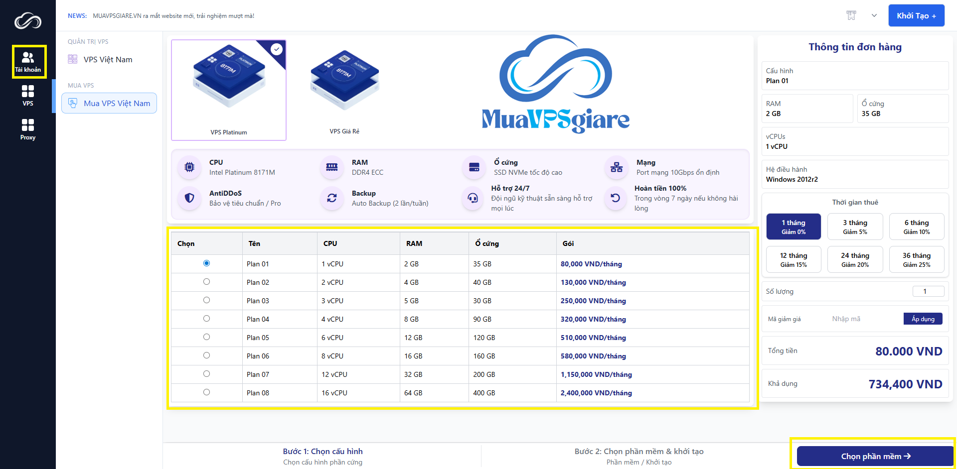 Trong menu bên trái, chọn VPS – Mua VPS -Chọn loại VPS phù hợp (ví dụ: VPS Giá Rẻ hoặc VPS Platinum) – Ở bảng cấu hình, tick vào gói VPS bạn muốn thuê (Plan 01, Plan 02, …) theo nhu cầu CPU, RAM và dung lượng ổ cứng – chọn xong cấu hình, nhấn nút “Chọn phần mềm” để tiếp tục bước cài đặt hệ điều hành