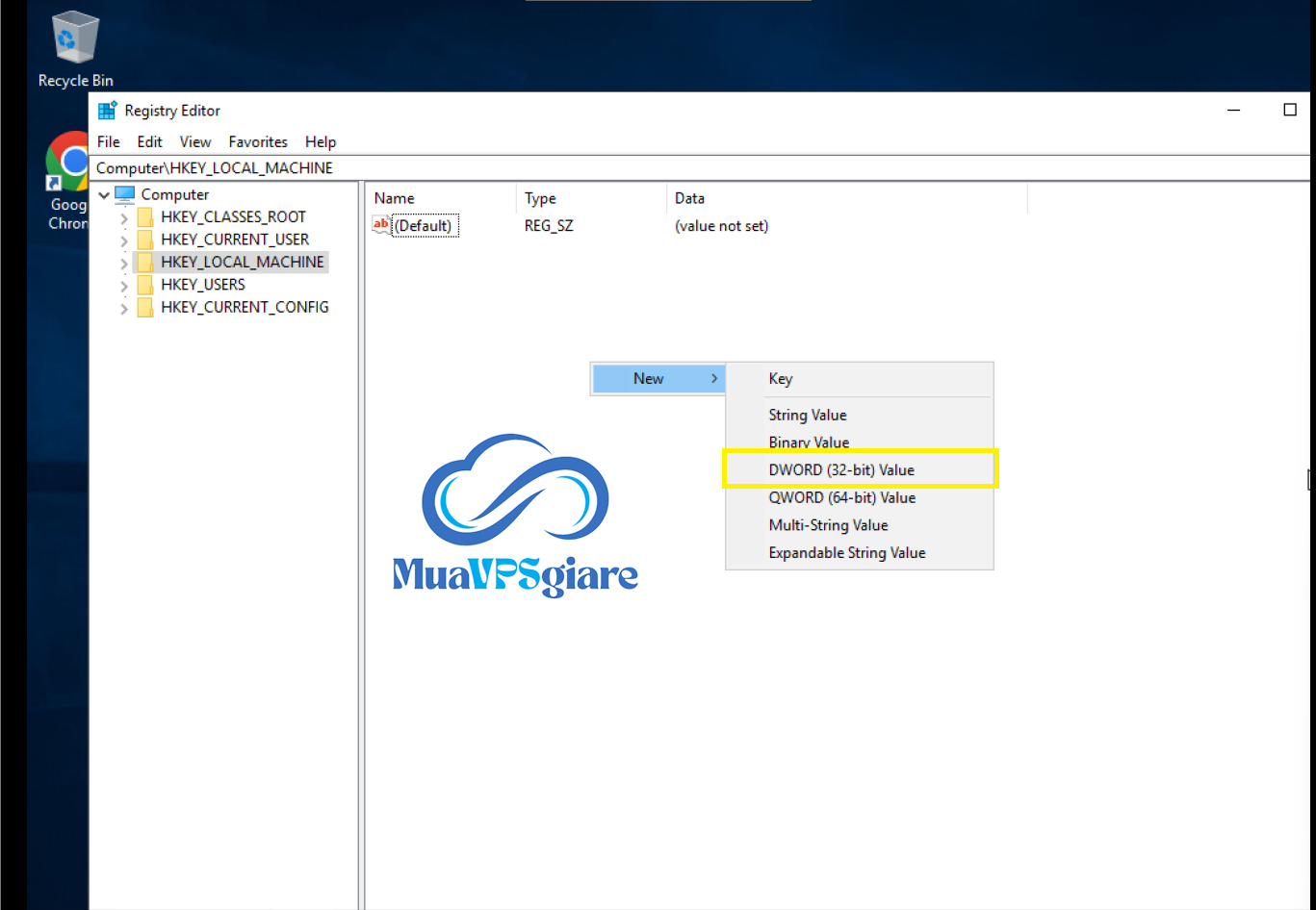Đăng nhập vào VPS Windows Server 2019 – mở Start Menu, gõ Registry Editor vào ô tìm kiếm – nhấp đúp chuột để mở Registry Editor.